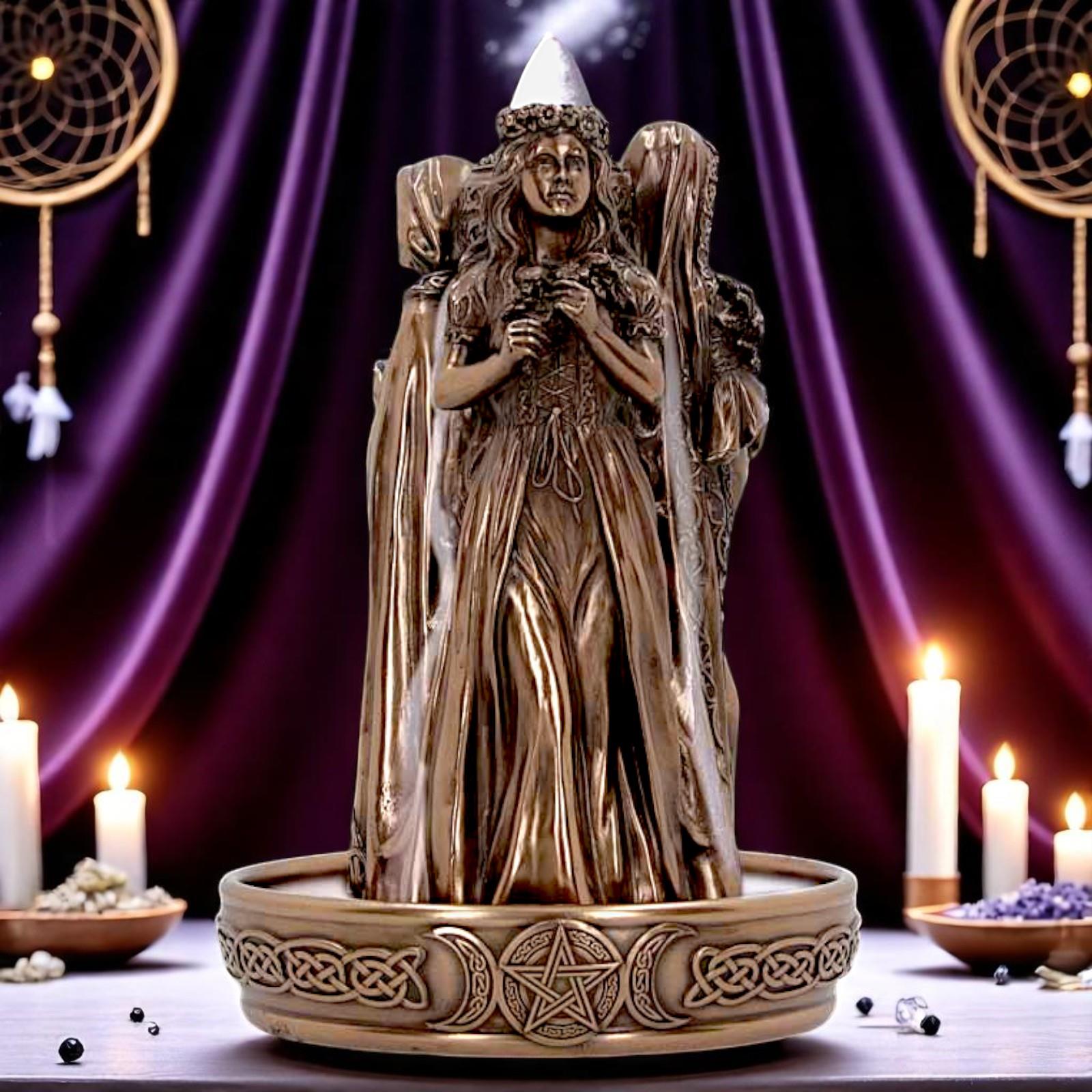 Cast in high-quality resin and finished in a mystical antique bronze effect, this piece features stunning Celtic knotwork and a central triple moon pentacle, perfect for any pagan altar or spiritual space. Designed for backflow incense cones, the smoke flows elegantly around the goddesses, creating an ethereal atmosphere.