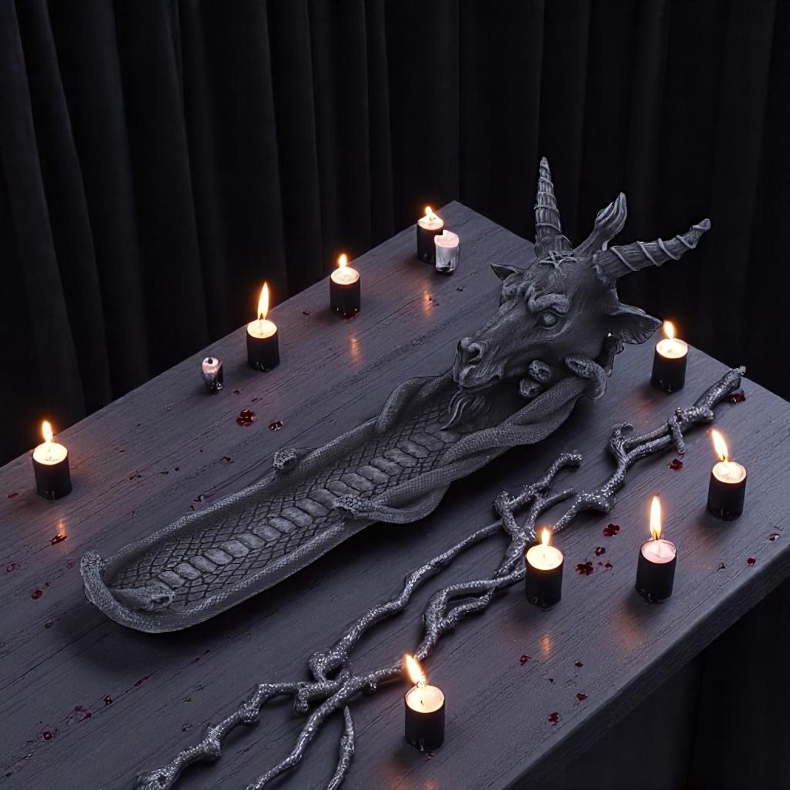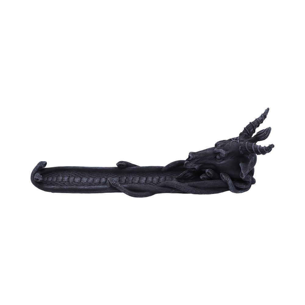 Featuring a horned Baphomet head at one end and a serpent winding down the tray, the design merges gothic detail with functionality. Ideal for burning standard incense sticks, this incense holder is a perfect addition to witchy altars, gothic homes, pagan rituals, or as a standout gift for fans of dark décor and the arcane arts.