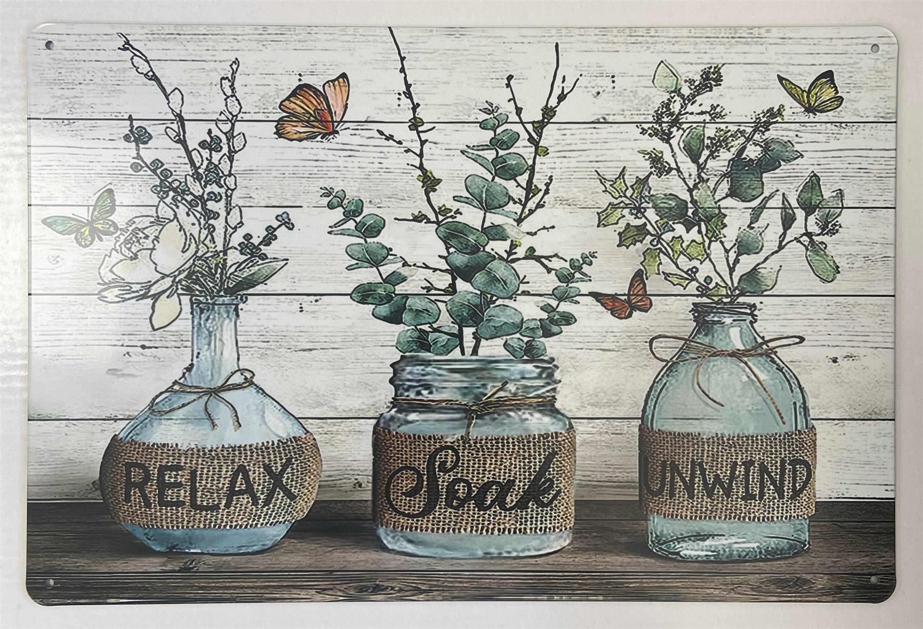 This beautiful 30 x 20 cm metal sign features three mason-style jars wrapped in burlap with the words Relax, Soak, Unwind, surrounded by delicate butterflies and greenery against a whitewashed wooden backdrop. The soft tones and rustic design bring a peaceful, natural charm to any space.