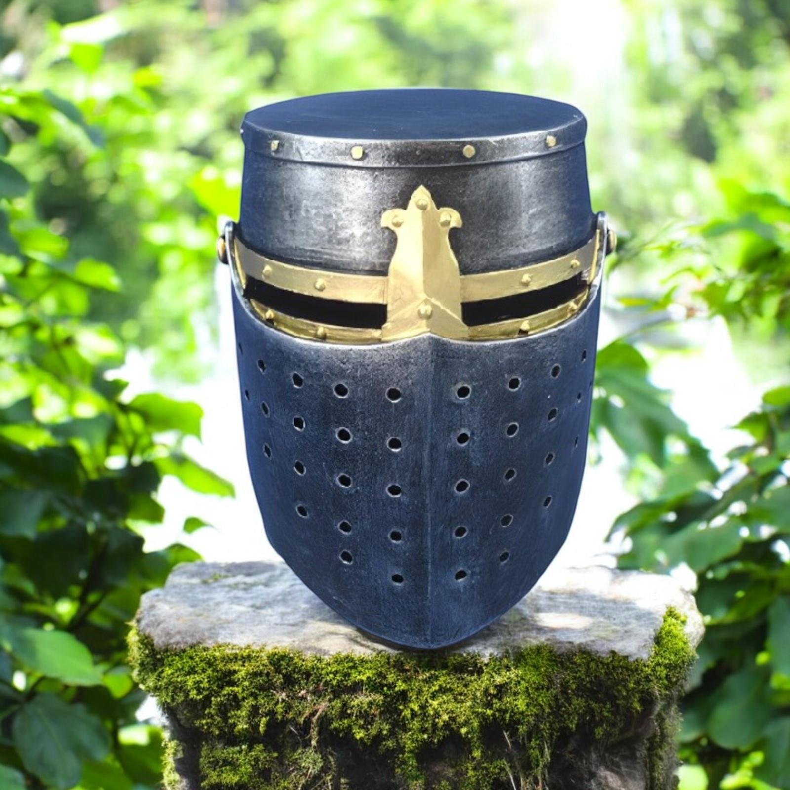 ✔ Authentic Templar Knight Helmet Design – Modeled after a classic crusader great helm, featuring intricate detailing with gold accents.
