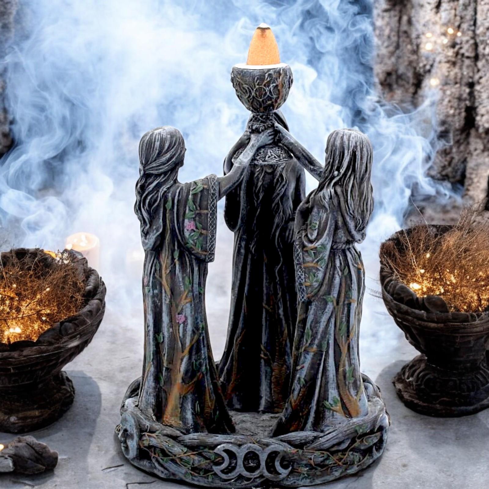Transform your sacred space with the Mother Maiden & Crone Backflow Incense Burner, a stunning representation of the Triple Goddess and a must-have for anyone who appreciates Wiccan, pagan, or mystical decor. This beautifully crafted incense burner doubles as a symbolic piece of art and a functional aromatherapy tool, creating a captivating and serene atmosphere in your home or altar.