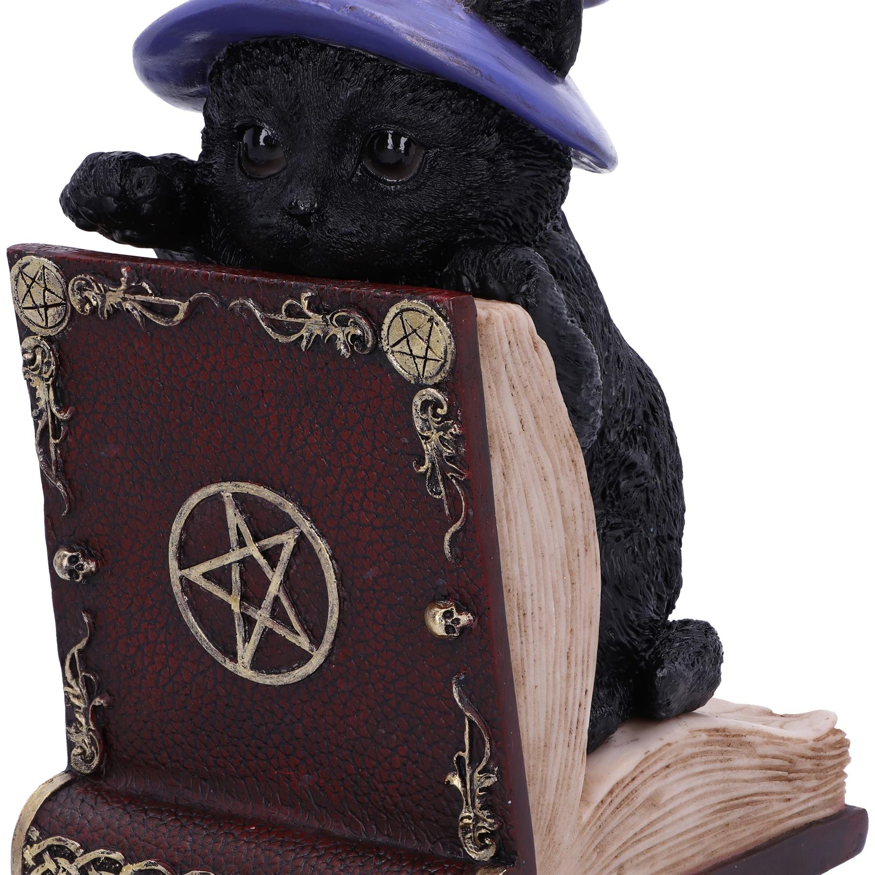 This Witch Cat Bookend is a beautifully detailed gothic-inspired resin figurine, featuring a black cat wearing a wizard's hat, perched over a mystical spellbook adorned with pentacle symbols.