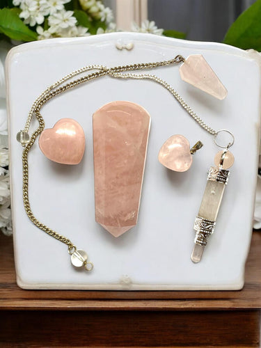 Rose Quartz Crystal Ultimate Pack - 50g Wand, Pendulum, Heart Pendant, Faceted Crystal & Heart in Pouch