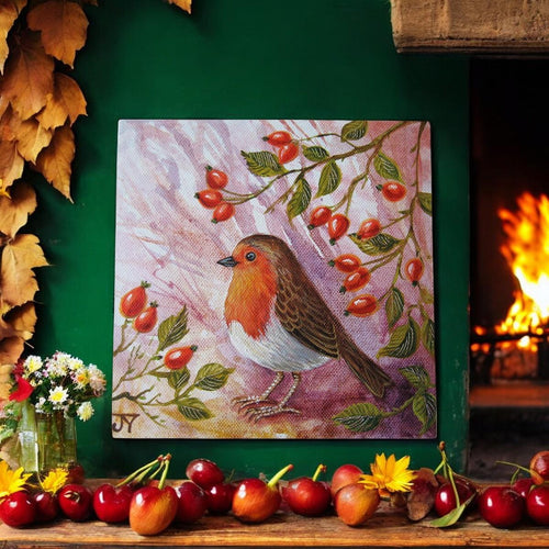 ROSE HIP ROBIN Ceramic Art Tile by Judith Yates - 20x20 cm - Ready to Hang - Collectible Home Decor