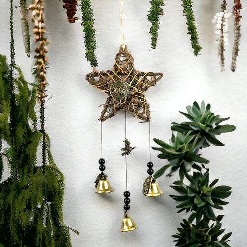 Witch's Wicker Pentagram Bells - Protective Hanging Decor - Enchanted Metal and Rope Charm - 40cm Wiccan Wall Accent for Positive Energy