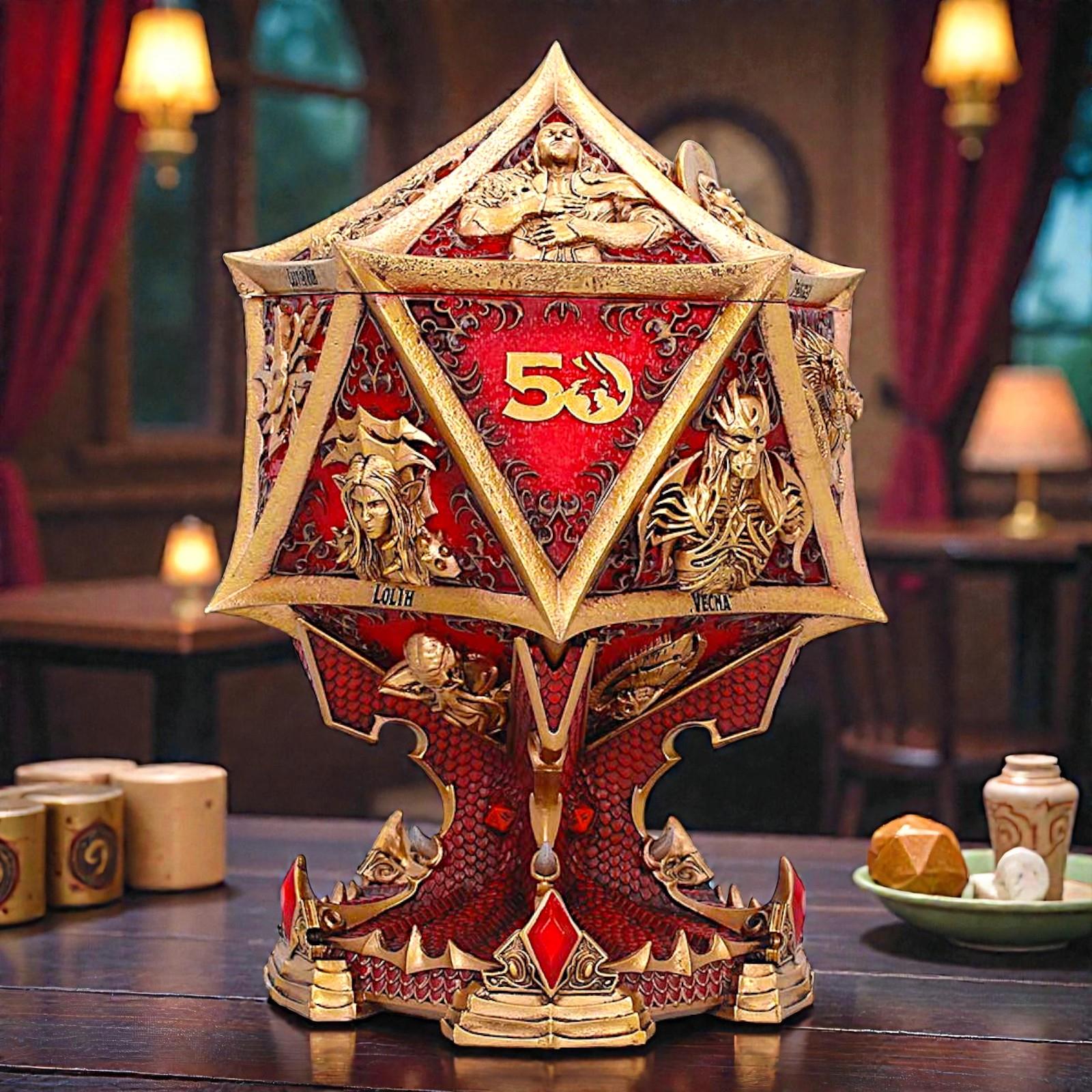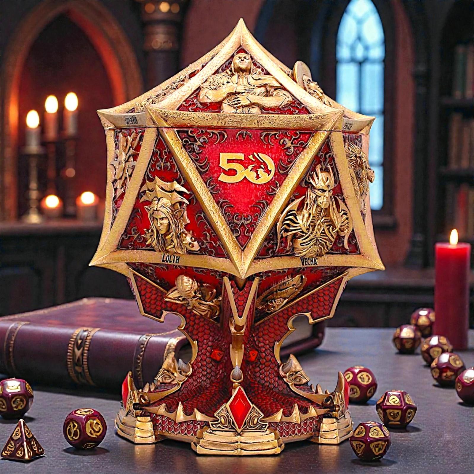 Whether displayed in a gaming den, collector’s cabinet, or retail showcase, this striking D20 anniversary box is a true statement piece celebrating the world’s most iconic roleplaying game.