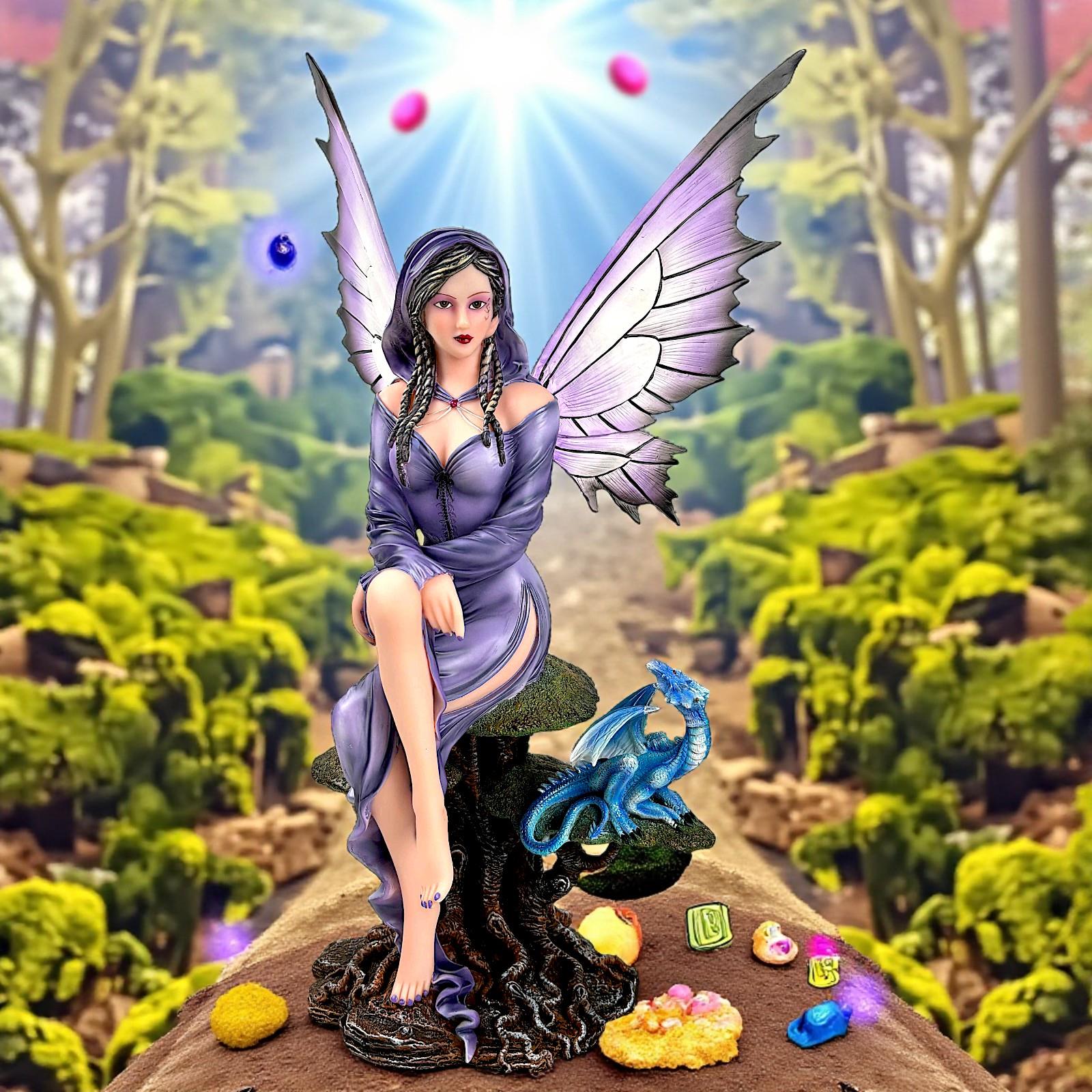 This enchanting sculpture depicts a serene fairy in a flowing lavender gown, seated gracefully upon a tree base beside a small blue dragon. Her delicate wings shimmer with soft lilac hues, symbolising balance between magic and serenity. The baby dragon gazes upward in trust, evoking a sense of connection between mythical beings.