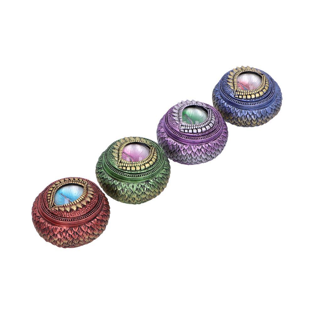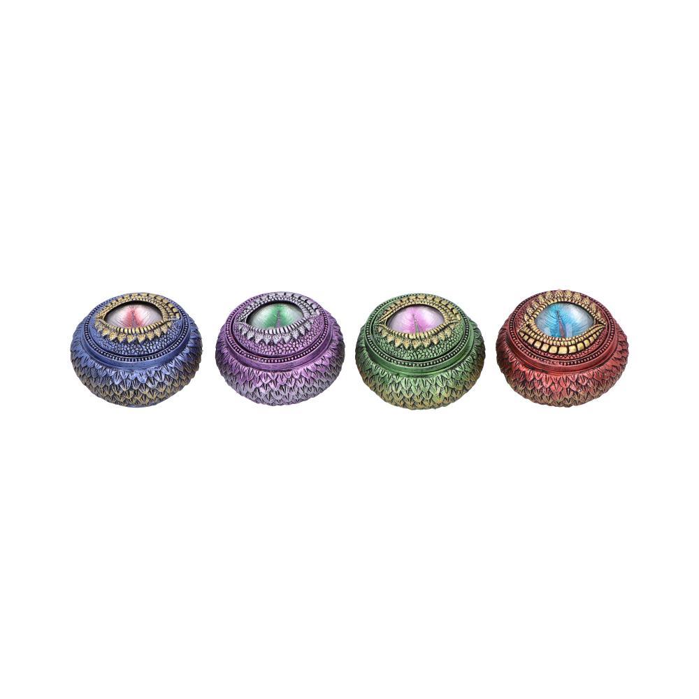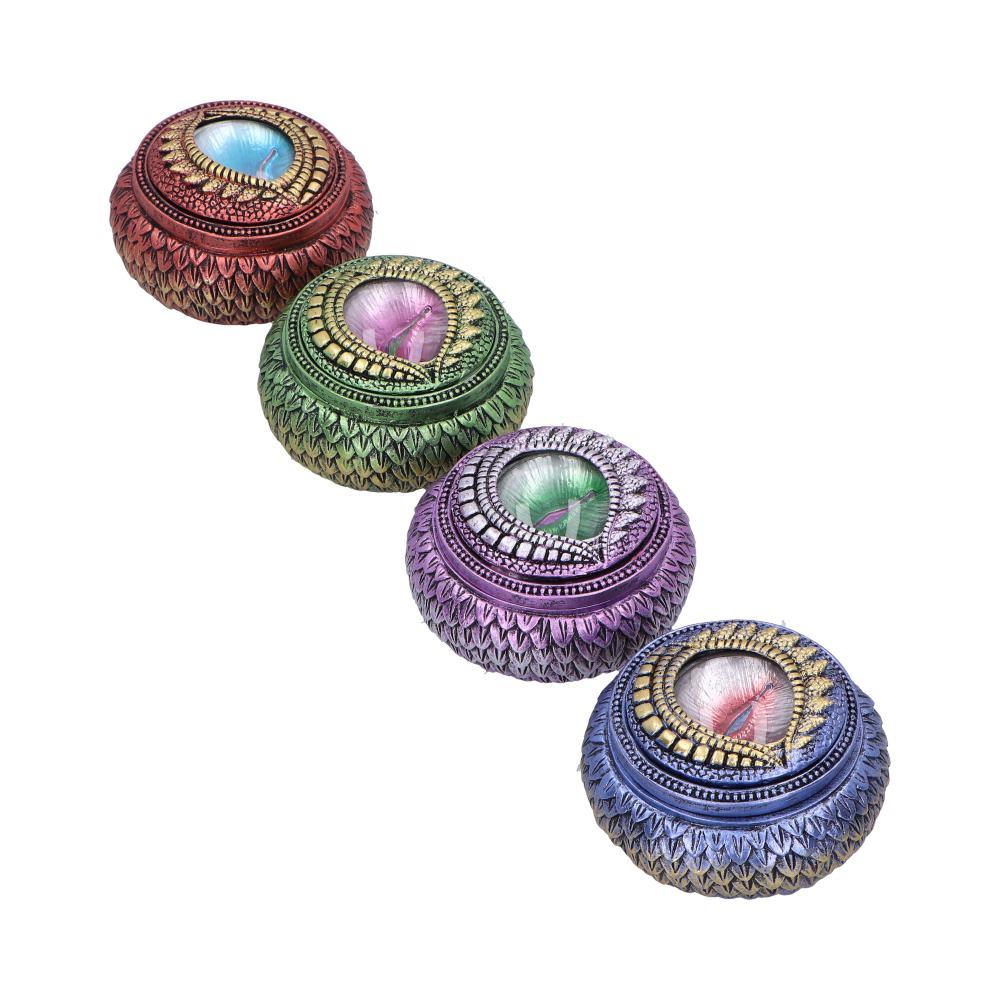 Each box features a vivid dragon eye in metallic red, green, purple, and blue tones, surrounded by detailed sculpted scales and shimmering gold and silver accents. Crafted from high-quality resin and expertly hand-painted, each lid lifts to reveal a hidden storage compartment — perfect for storing jewellery, crystals, or other mystical treasures.