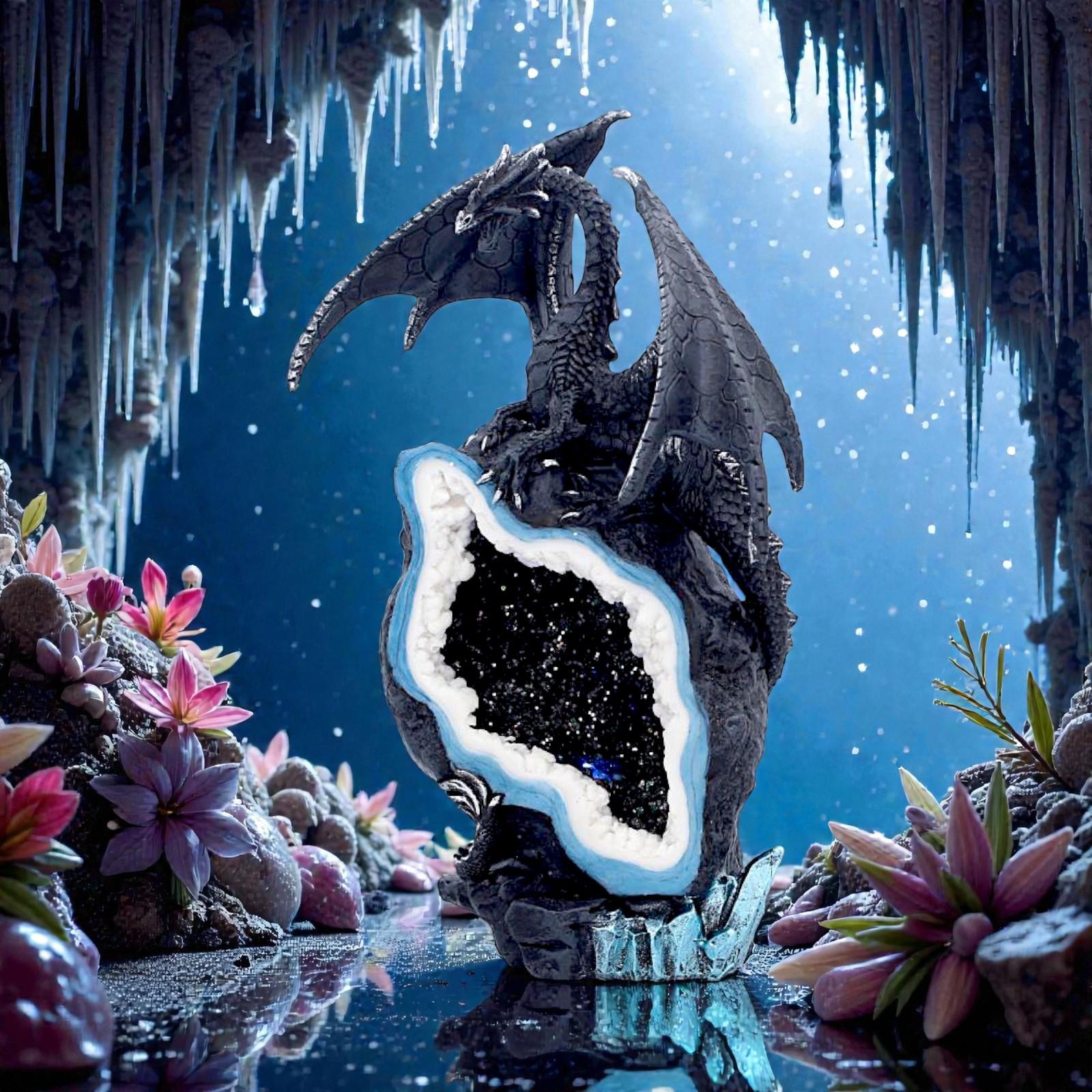 Perched protectively atop a shimmering crystal-style geode, the Midnight Custodian dragon spreads its wings in a commanding pose. The centre features a striking crystalline cavity with layered detailing that mimics a natural geode formation, enhanced by an integrated LED light effect that creates a glowing, magical ambience.