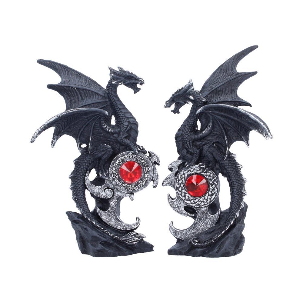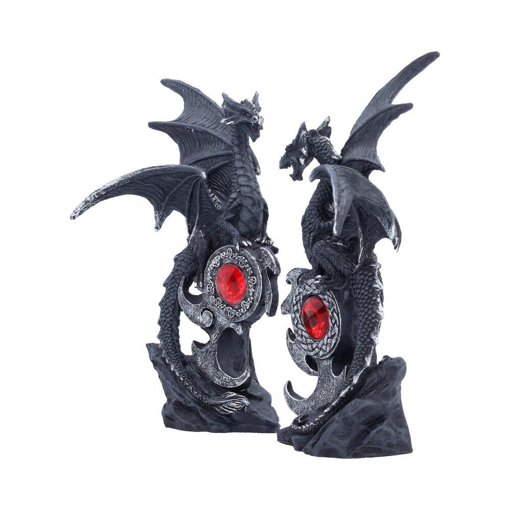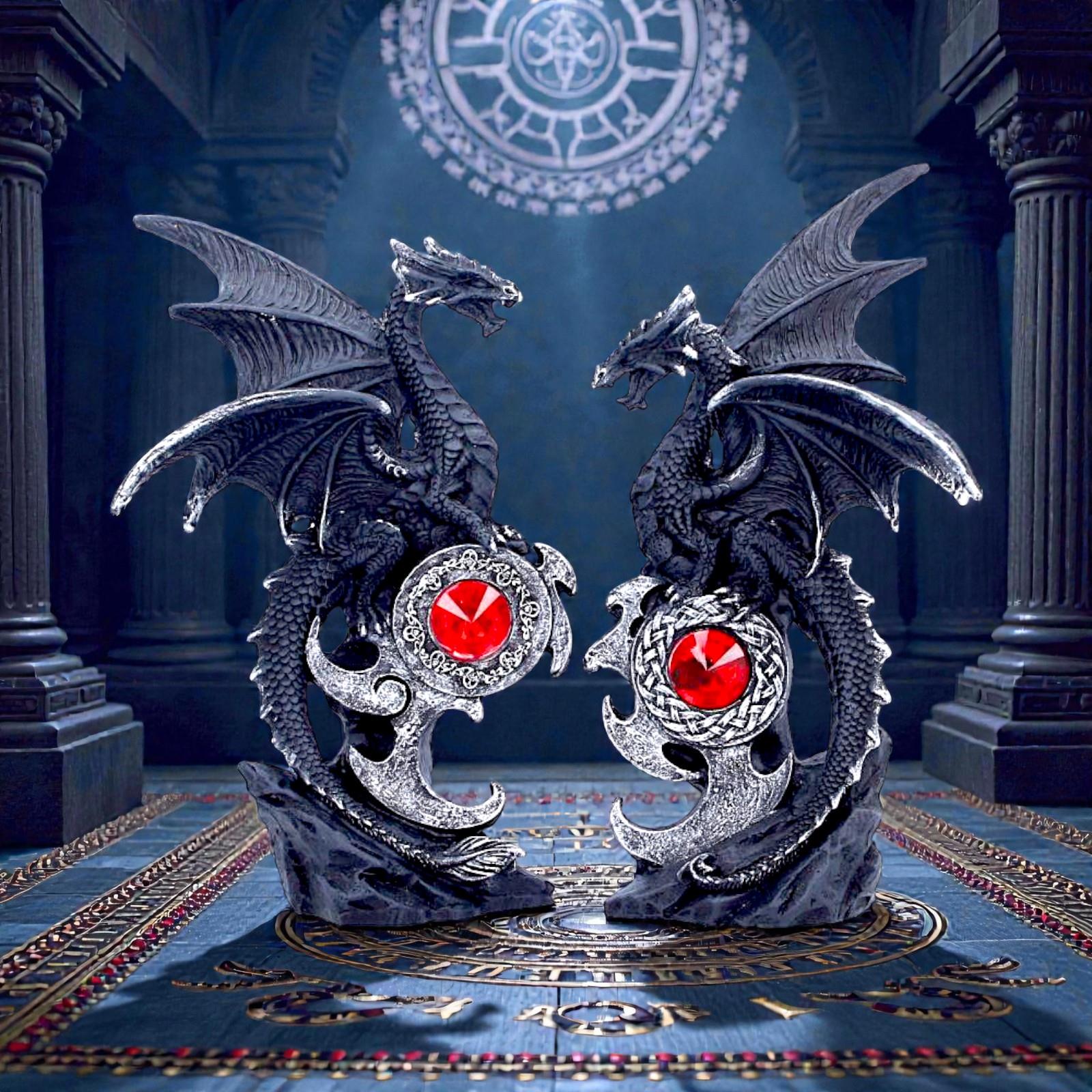 This dramatic set features two intricately sculpted black dragons, wings spread wide, poised protectively around striking red gemstone centrepieces. Each dragon perches atop a detailed base, forming a powerful mirrored design when placed together.