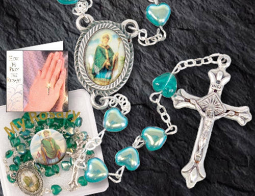 Irischer St. Patrick-Rosenkranz aus Glas in Herzform – katholischer Gebetsrosenkranz mit schillernden grünen Herzen, inkl. Gebetskarte und Erinnerungsbox