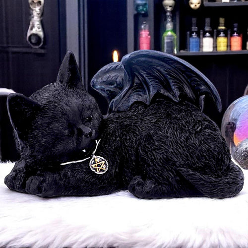 Gothic Black Vampire Cat Statue Bat Wings & Pentagram Necklace Witchcraft Decor