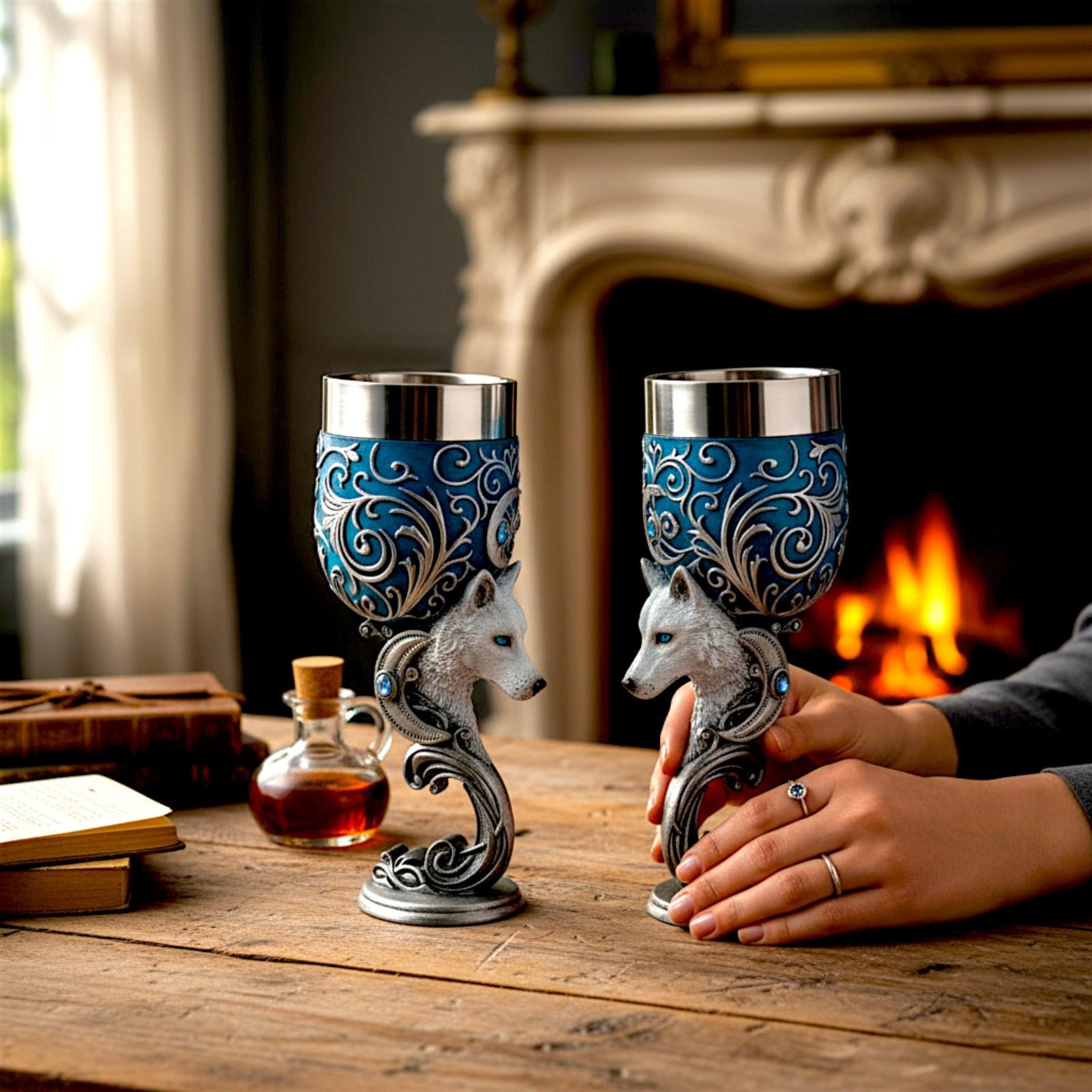 Fantasy White Wolf Enchanted Goblet Set Gothic Chalice Mystical Drinkware Art