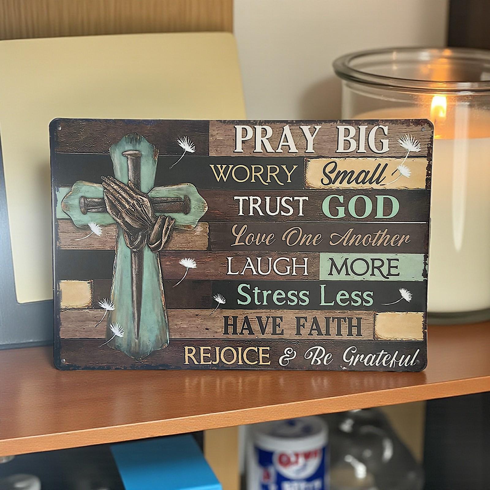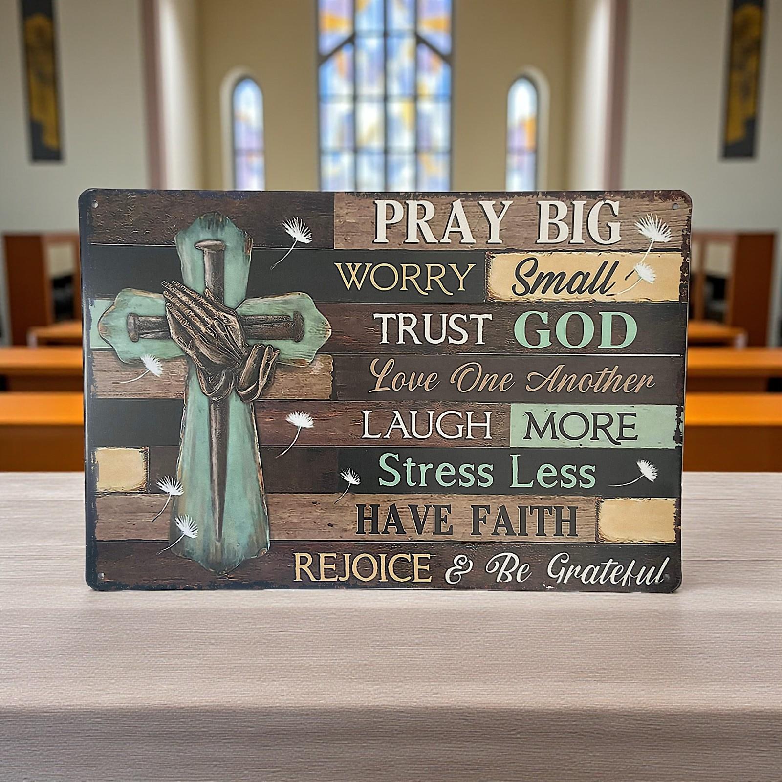 The design showcases praying hands over a cross set against a rustic wooden background, symbolising hope, love, and gratitude. Measuring 30 x 20 cm, this durable metal plaque makes a perfect gift for Christians, or a meaningful piece of religious wall décor for your living room, hallway, or prayer space.