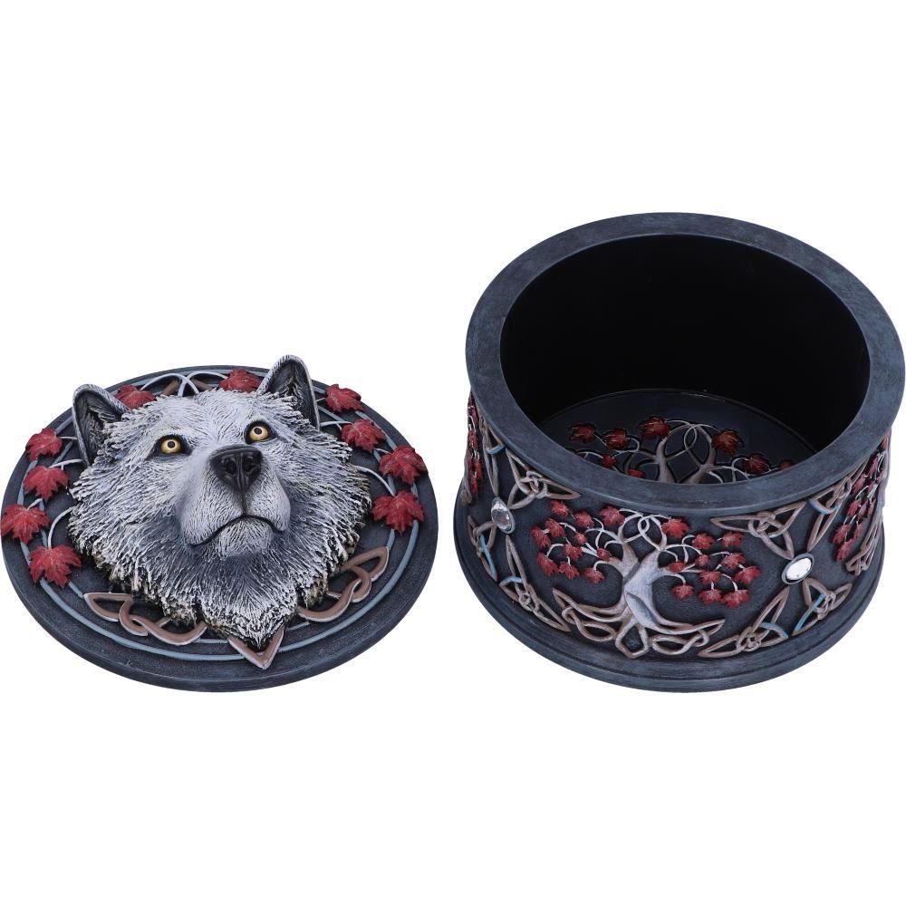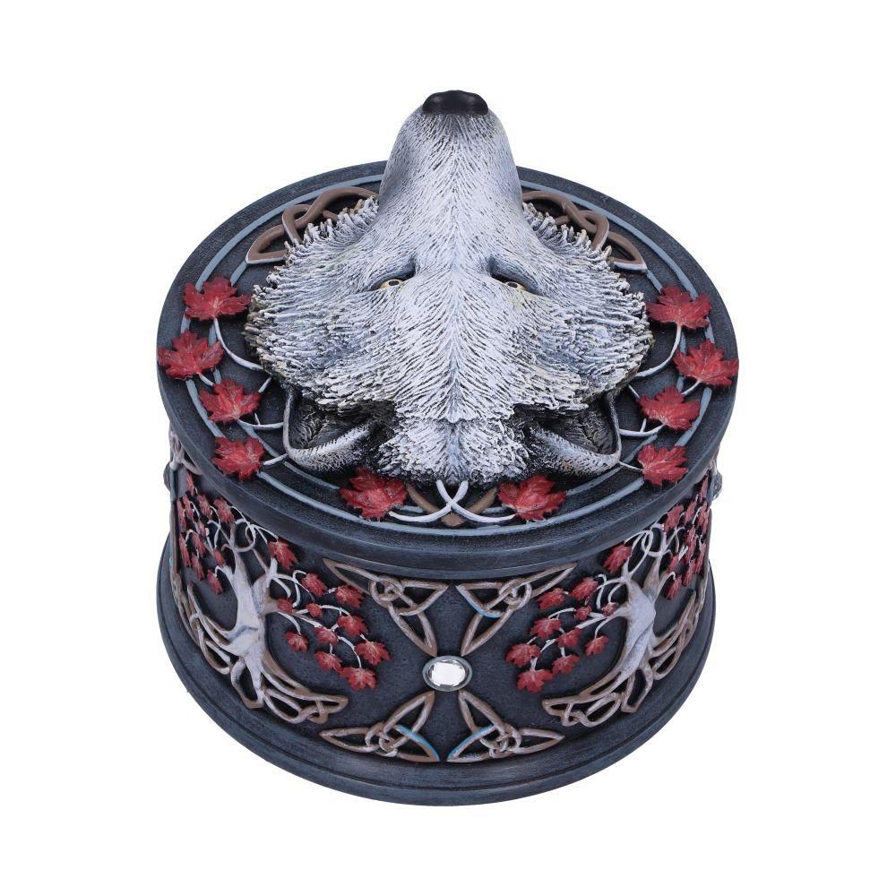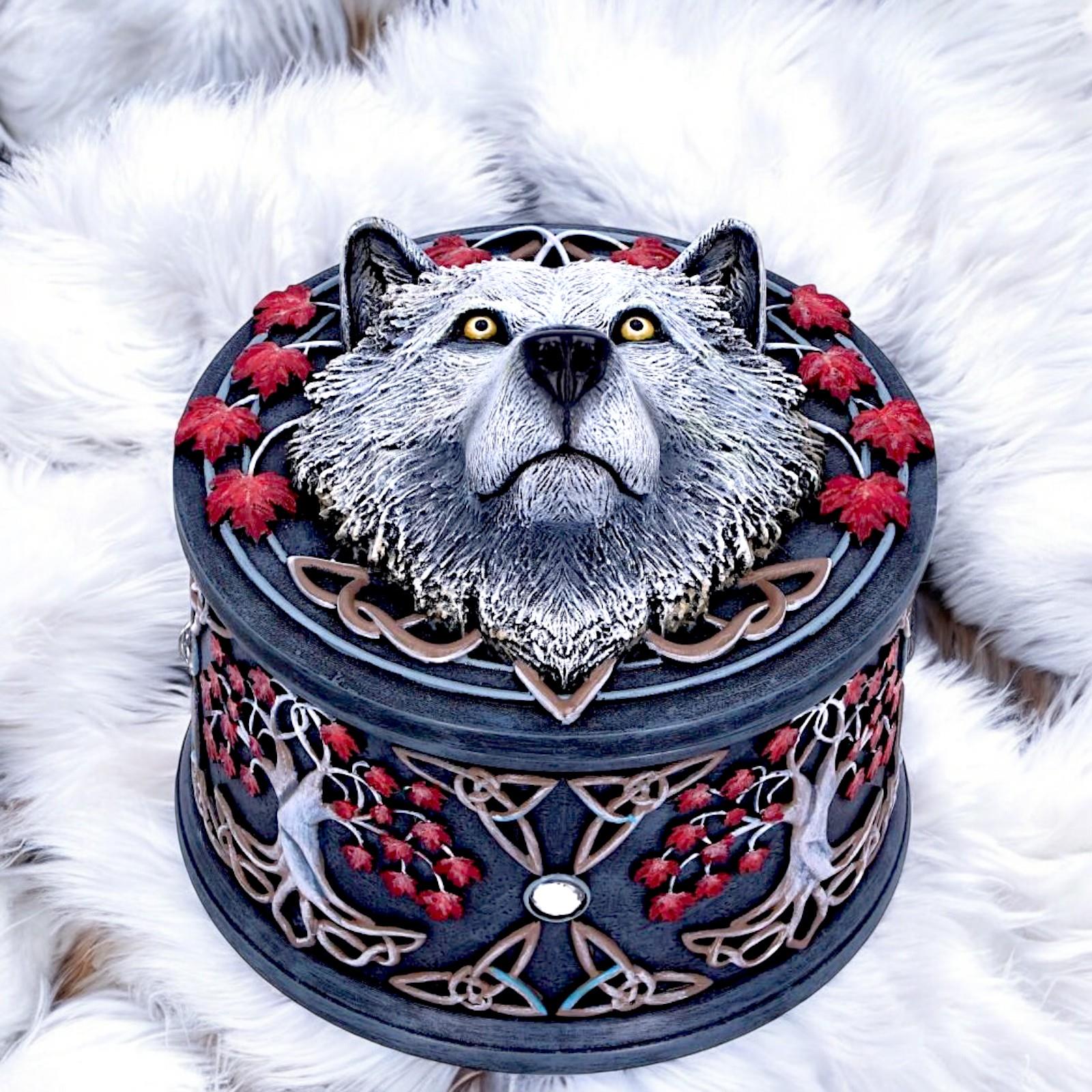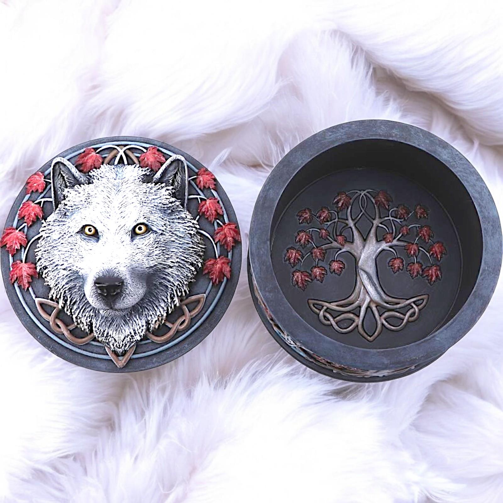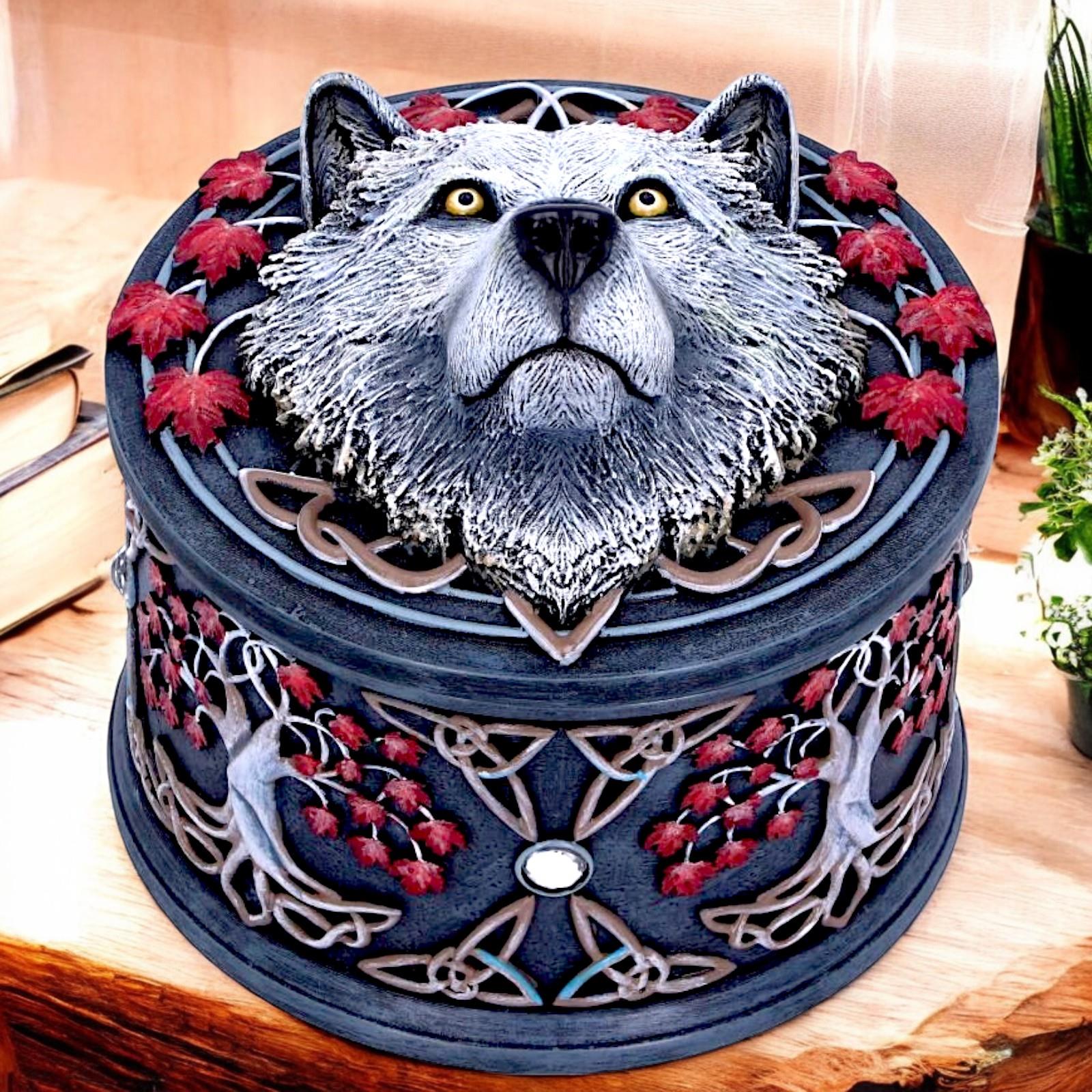 This Guardian of the Fall trinket box is more than just a storage piece—it's a symbol of nature’s strength and wisdom. Whether used as a decorative centrepiece, a jewellery box, or a Celtic-inspired altar accessory, it captures the beauty of autumn and the spirit of the wolf.